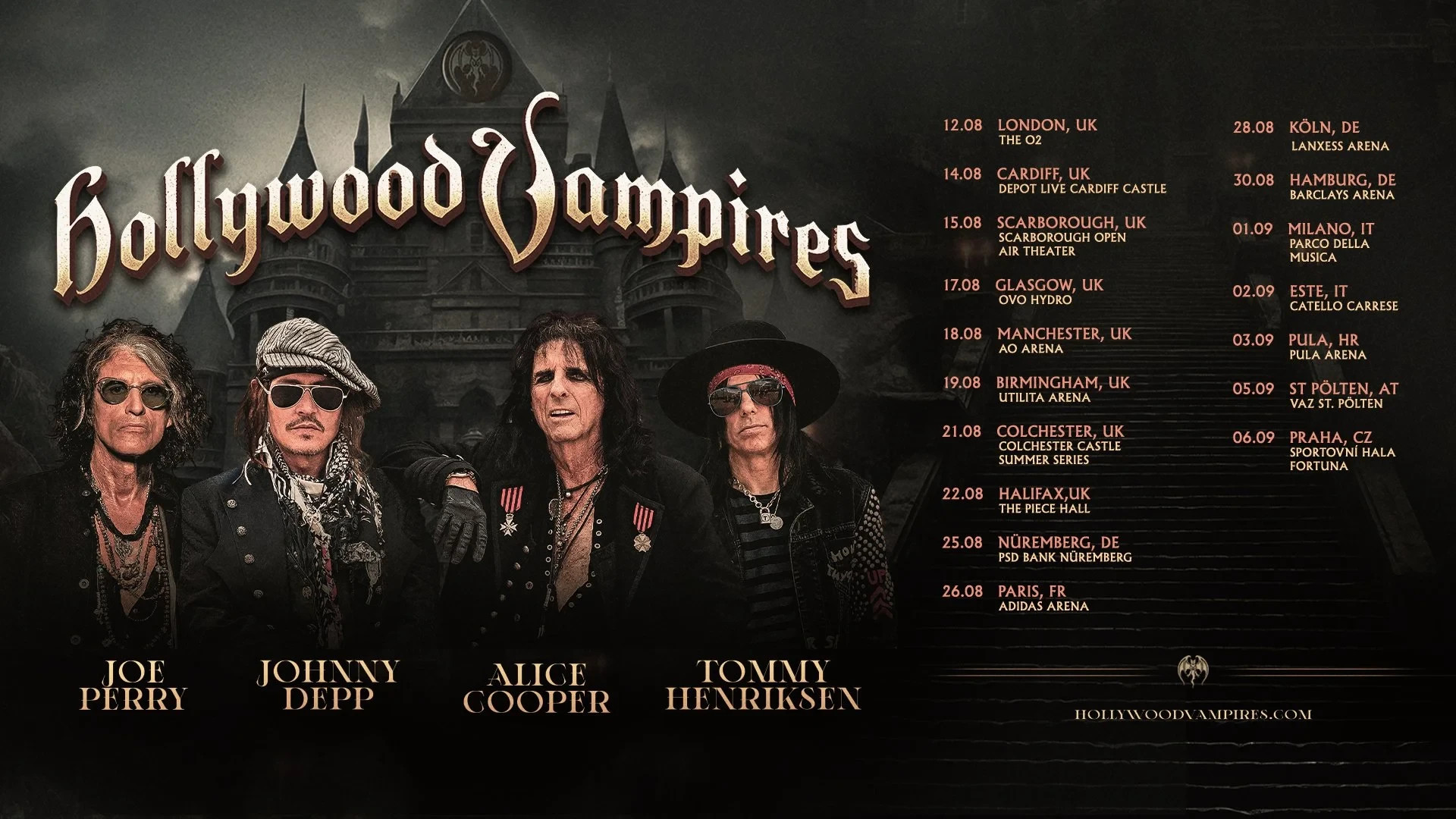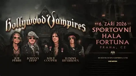 The supergroup Hollywood Vampires, formed in 2012 by well-known names not only from the music world, has announced its first tour in three years. The UK & European Tour 2026 will take place in August and September 2026, with stops in the United Kingdom, France, Italy, Germany, Austria, and the Czech Republic. They will visit Prague on September 6, 2026, performing at the Sportovní hala Fortuna.