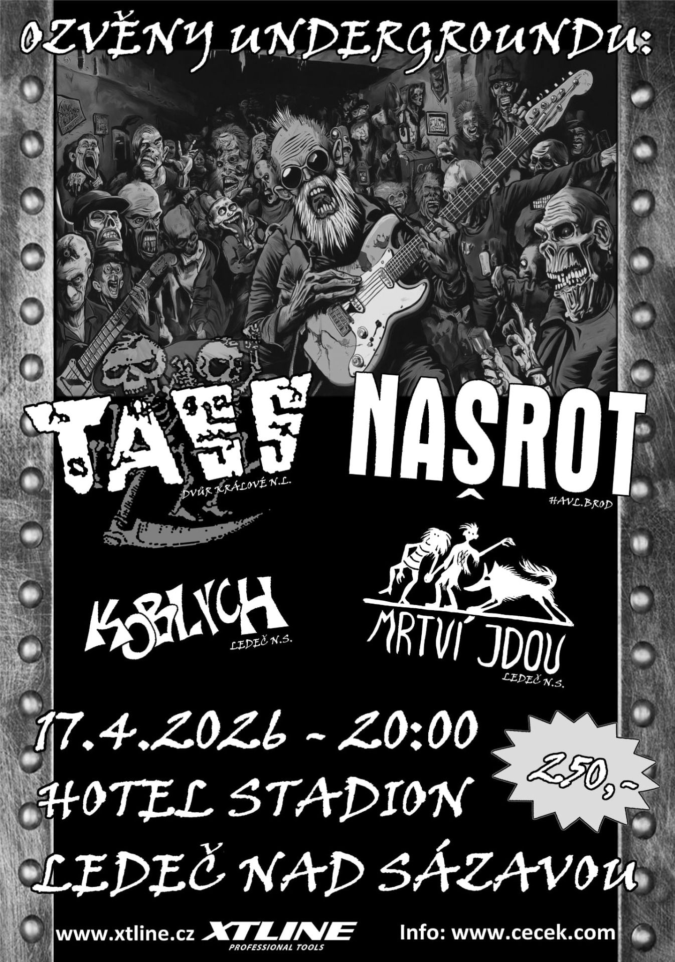 The headliner of the night will be the Havlíčkův Brod crossover mainstay NAŠROT, returning to Ledeč with a no-compromise set. From Dvůr Králové nad Labem, the hardcore-punk force TASS will arrive to deliver their intense performance. Local representation and an authentic underground vibe will be provided by Ledeč-based bands KOBLYCH and MRTVÍ JDOU.