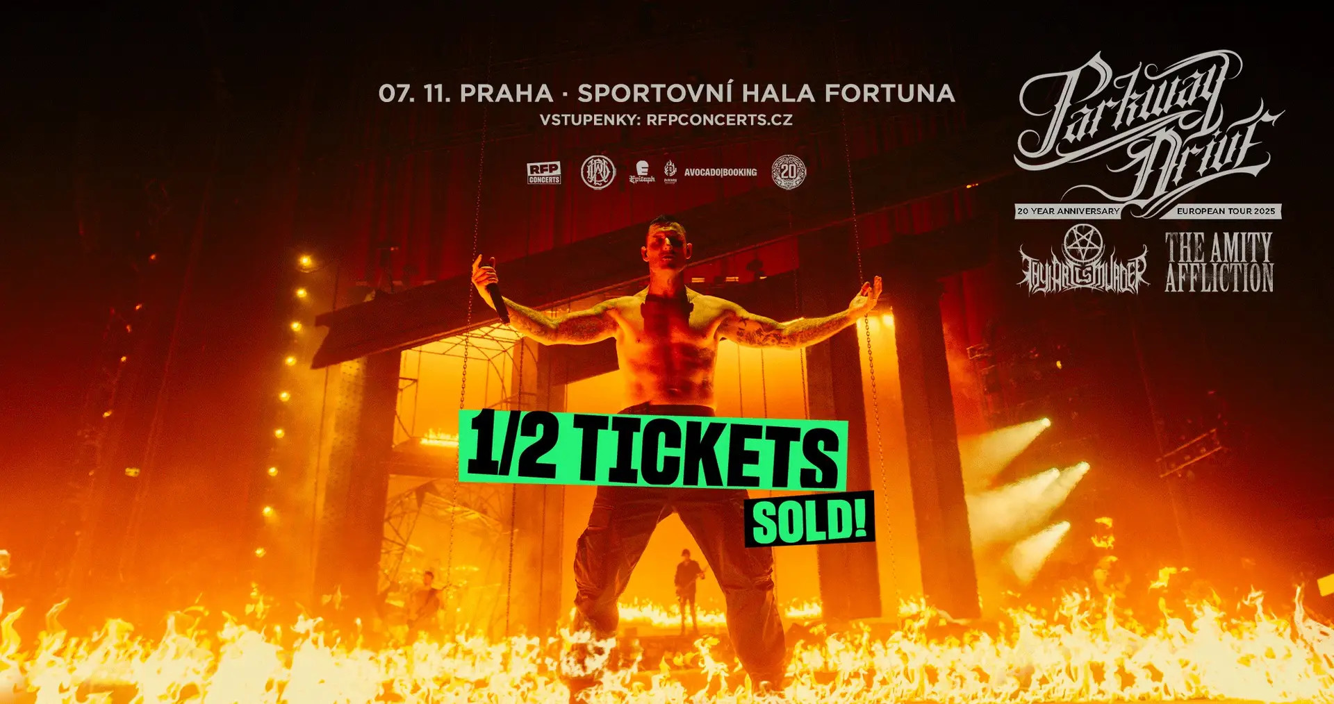 Českým fanouškům dobře známí metalcoroví Parkway Drive se vrací do České republiky po neuvěřitelně nabušeném vystoupení na Rock for People 2024, kde publikum zanechali v úžasu. Kapela, jejíž živá vystoupení jsou považována za legendární svou energií, drivem a velkolepou produkcí, rozproudí 7. listopadu 2025 Sportovní halu Fortuna během svého "PARKWAY DRIVE 20 Year Anniversary European Tour". Doprovázet je budou jako speciální hosté krajané Thy Art Is Murder a The Amity Affliction.