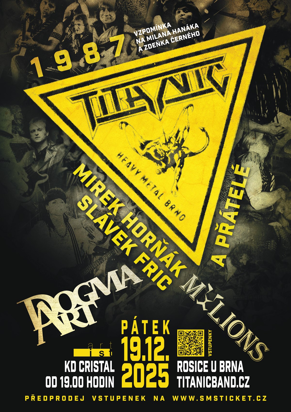 Brno legend Titanic returns with an extraordinary project "TITANIC 1987 live & guests", which will commemorate the golden era of the band and the personalities who shaped it. After the release of the live album Jihlava 1987, which received enthusiastic responses from fans, Titanic decided to revive the atmosphere of the late eighties and at the same time pay tribute to the deceased members Zdeněk Černý and Milan Hanák. Several guests will take turns on stage as singers, who, together with the original band members, will recall iconic songs and the spirit of the times.