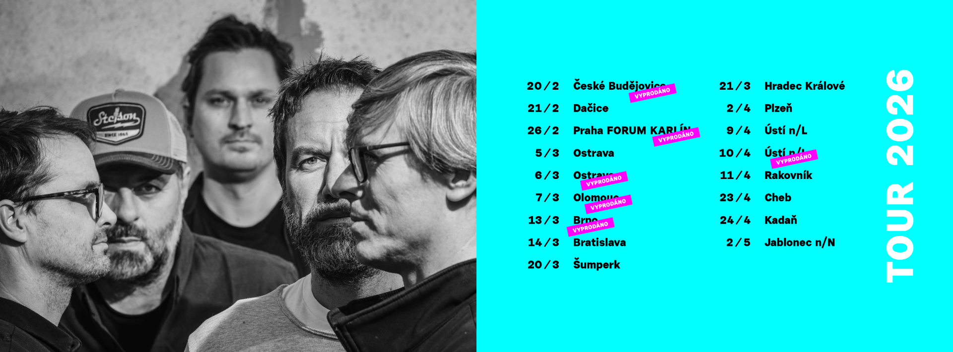 Přesně v den vydání alba, 26. 02. 2026, se konal největší koncert v pražském Fóru Karlín, kde bylo album pokřtěno. Mezi další zastávky turné se řadí například Brno, Bratislava, Hradec Králové, Plzeň nebo Cheb. Zakončeno bude 02. 05. 2026 v Jablonci nad Nisou.